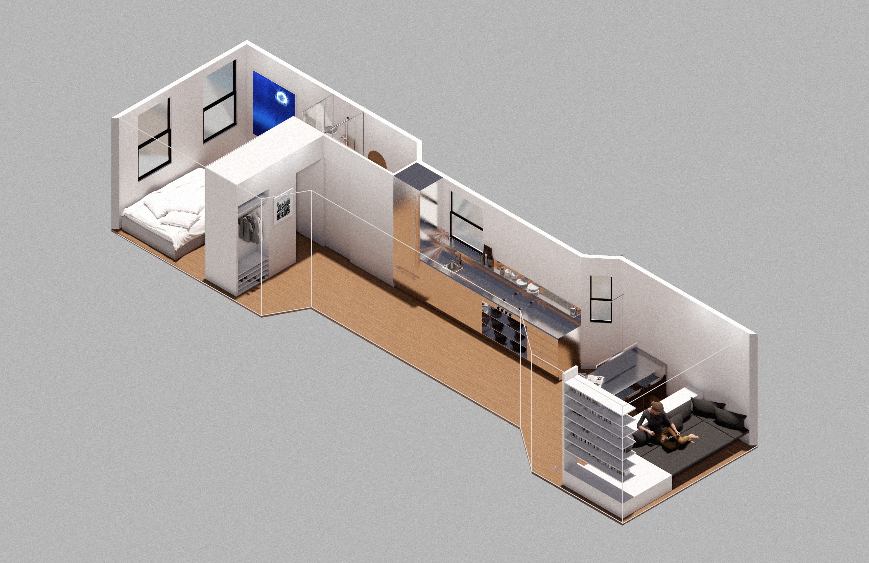 In the bedroom, the design continues with clean lines and minimalistic decor, creating a serene retreat from the city‘s hustle and bustle. The space is optimized for comfort, with built-in wardrobes and storage that maintain the room‘s uncluttered appearance. Large windows invite natural light, further enhancing the airy, open feel of the apartment.