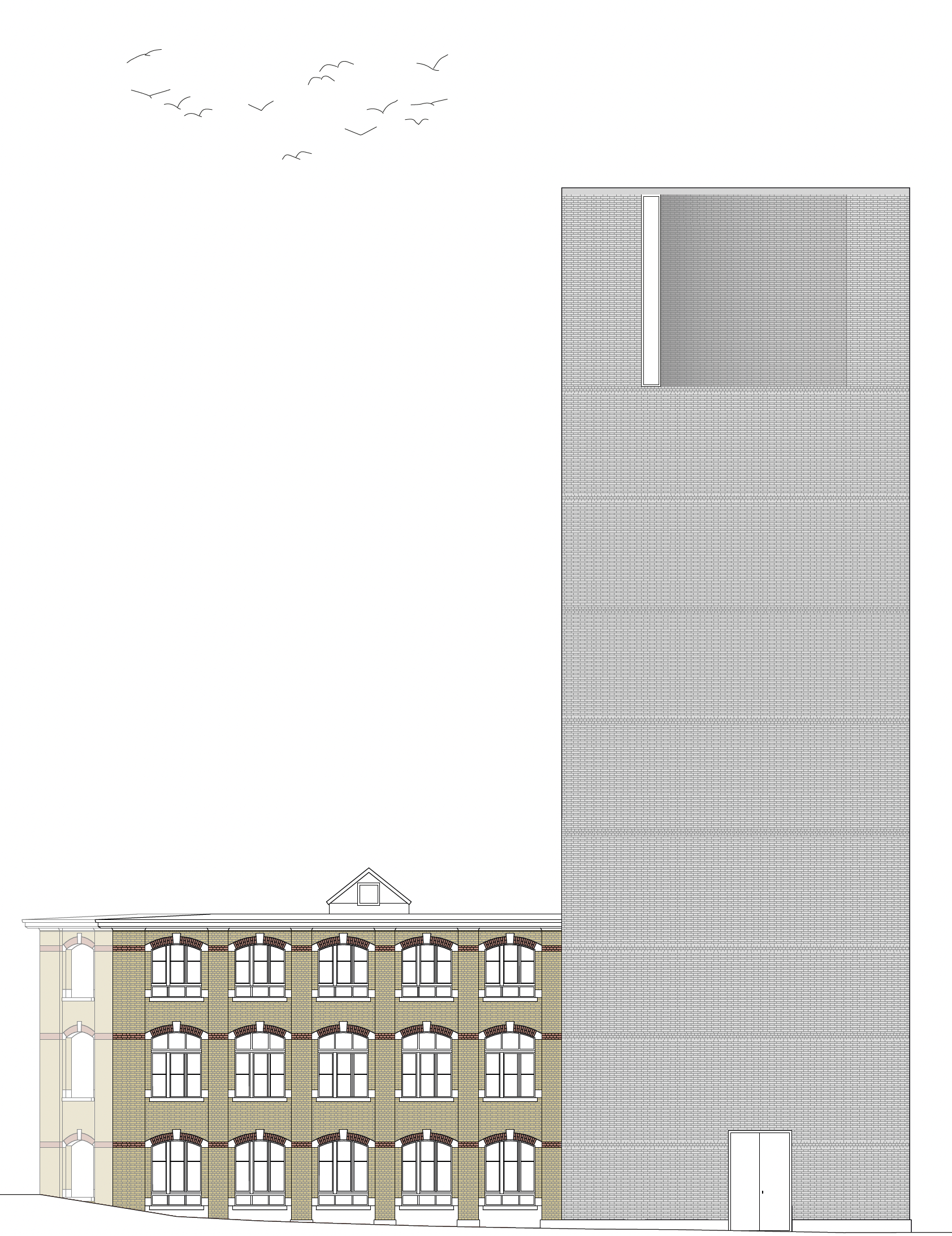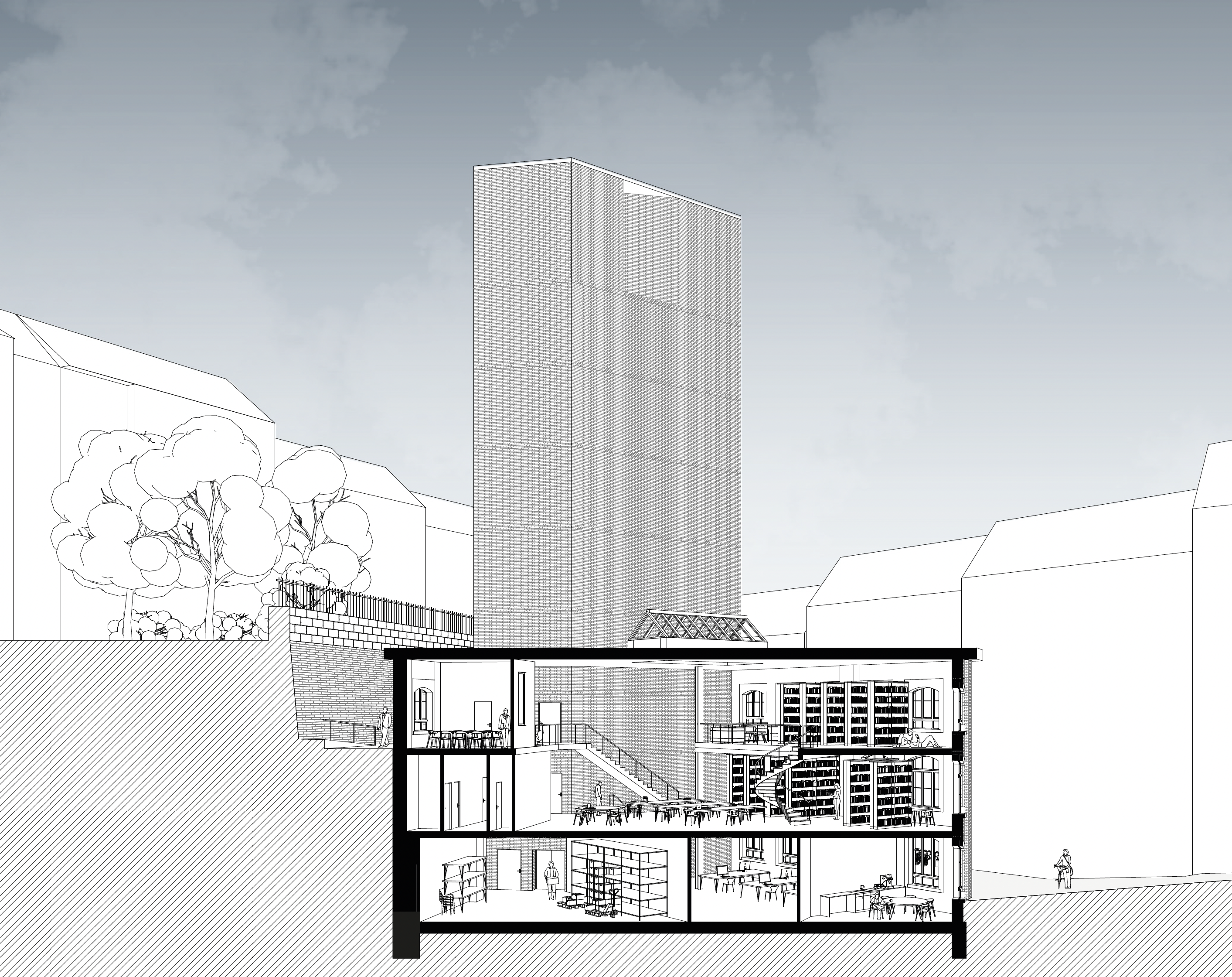 The new tower will feature a visible brick structure, establishing a strong material connection with the historic facade. From within, the exposed brickwork reinforces the sense of stability and permanence, emphasizing the archival function of the space while celebrating the transition of objects from storage to workspace. The integration of old and new elements highlights the evolving nature of the building’s purpose, transforming it into a place where architectural heritage, preservation, and knowledge production converge.