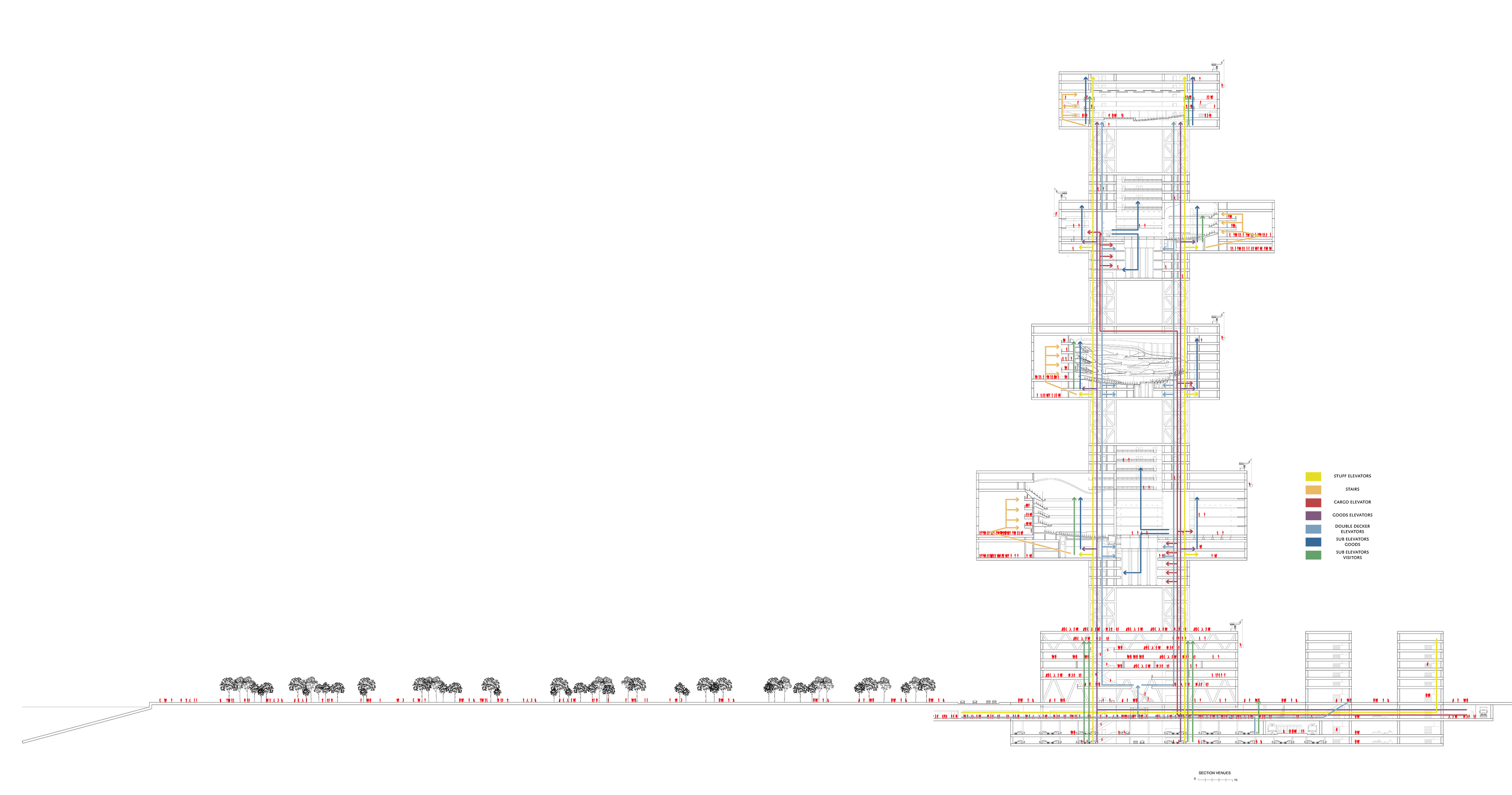 The access system is divided into passenger elevators and goods elevators. The elevators connect the venues to the single or double-decker lobbies according to their number of visitors. Here, another system of sublifts and open staircases leads to the foyer of the auditorium.