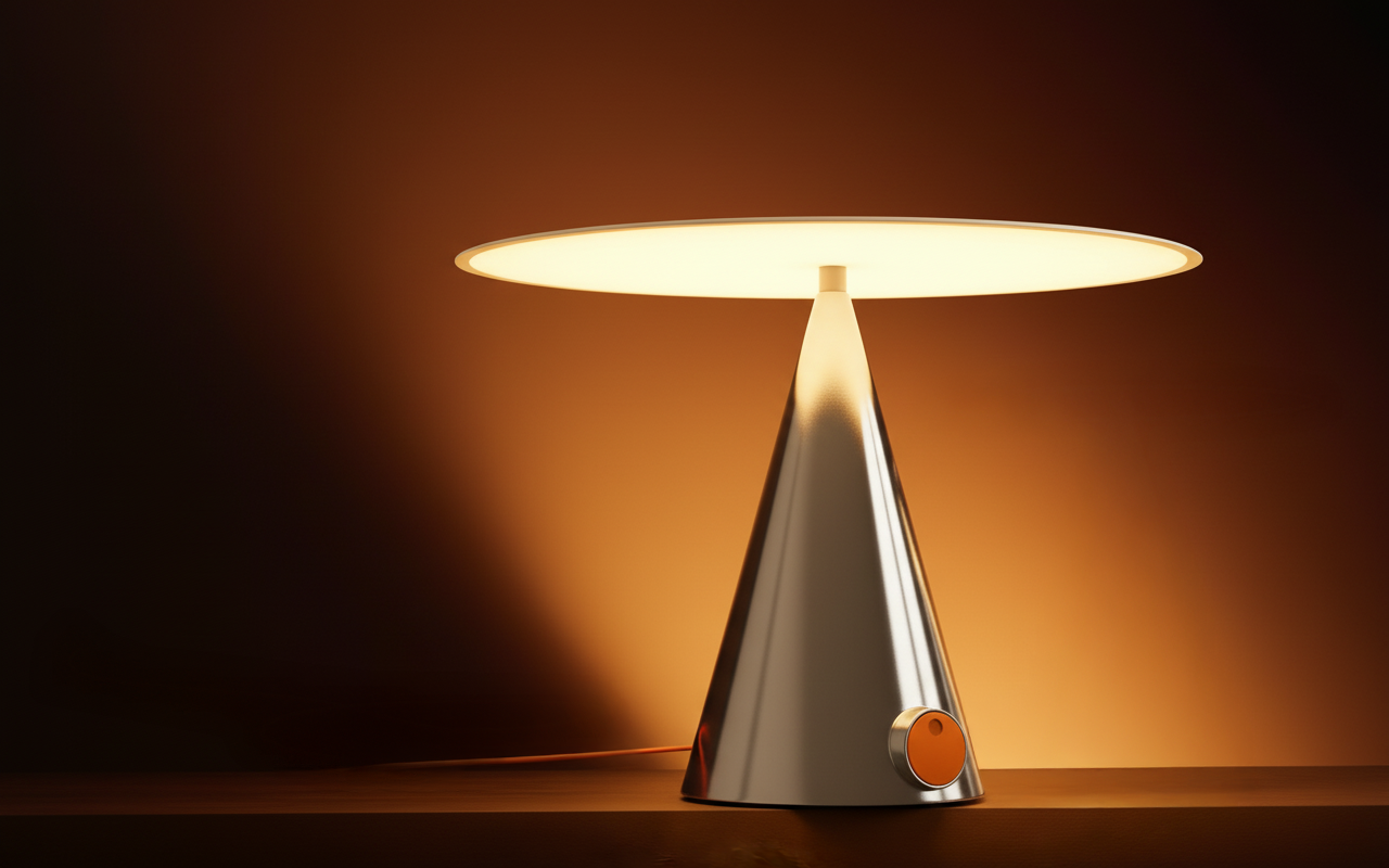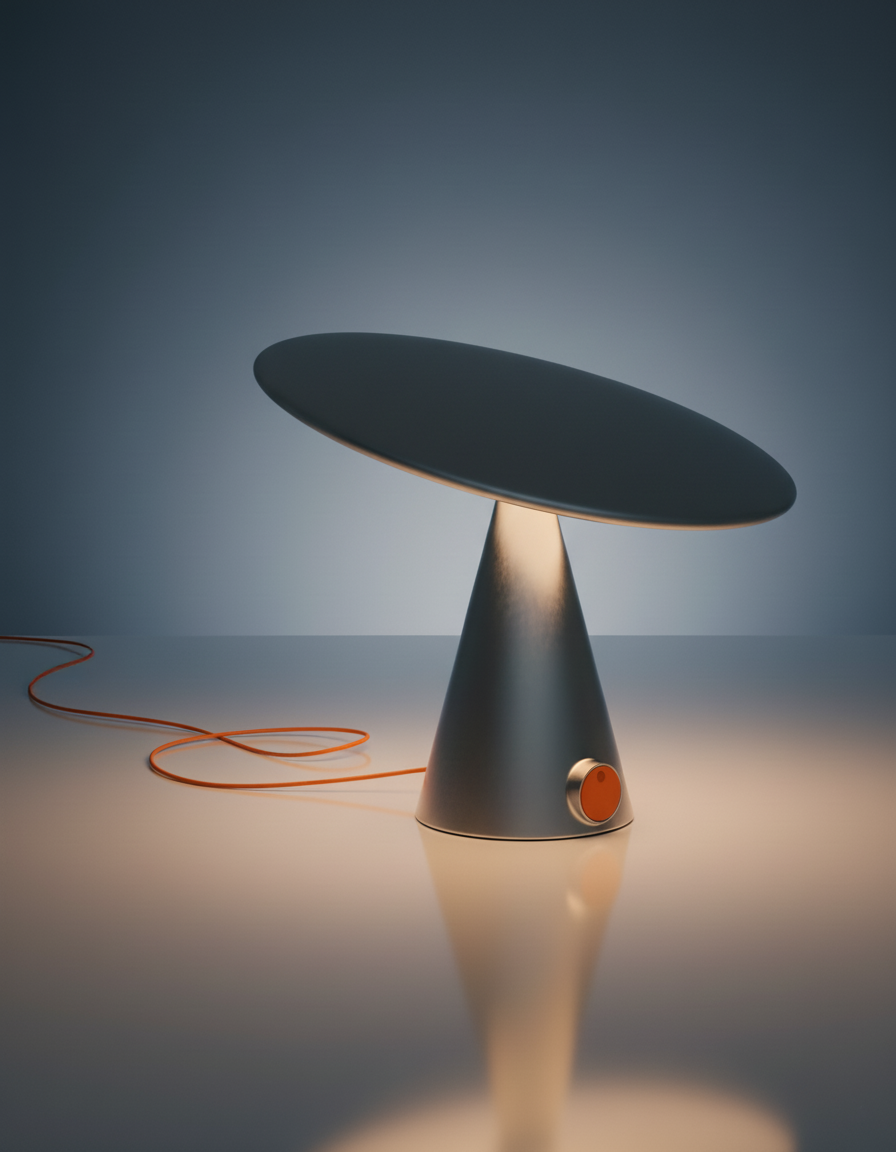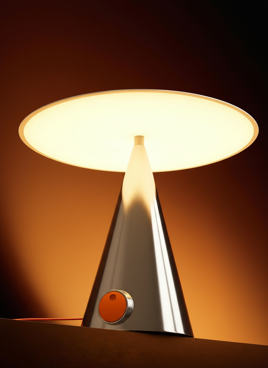 This Table Lamp blends simplicity with presence. A conical base in polished metal rises to support a wide, disc-like shade, casting a soft and even glow. Its geometry is reduced to essentials, yet the play of light and reflection gives it warmth and character.