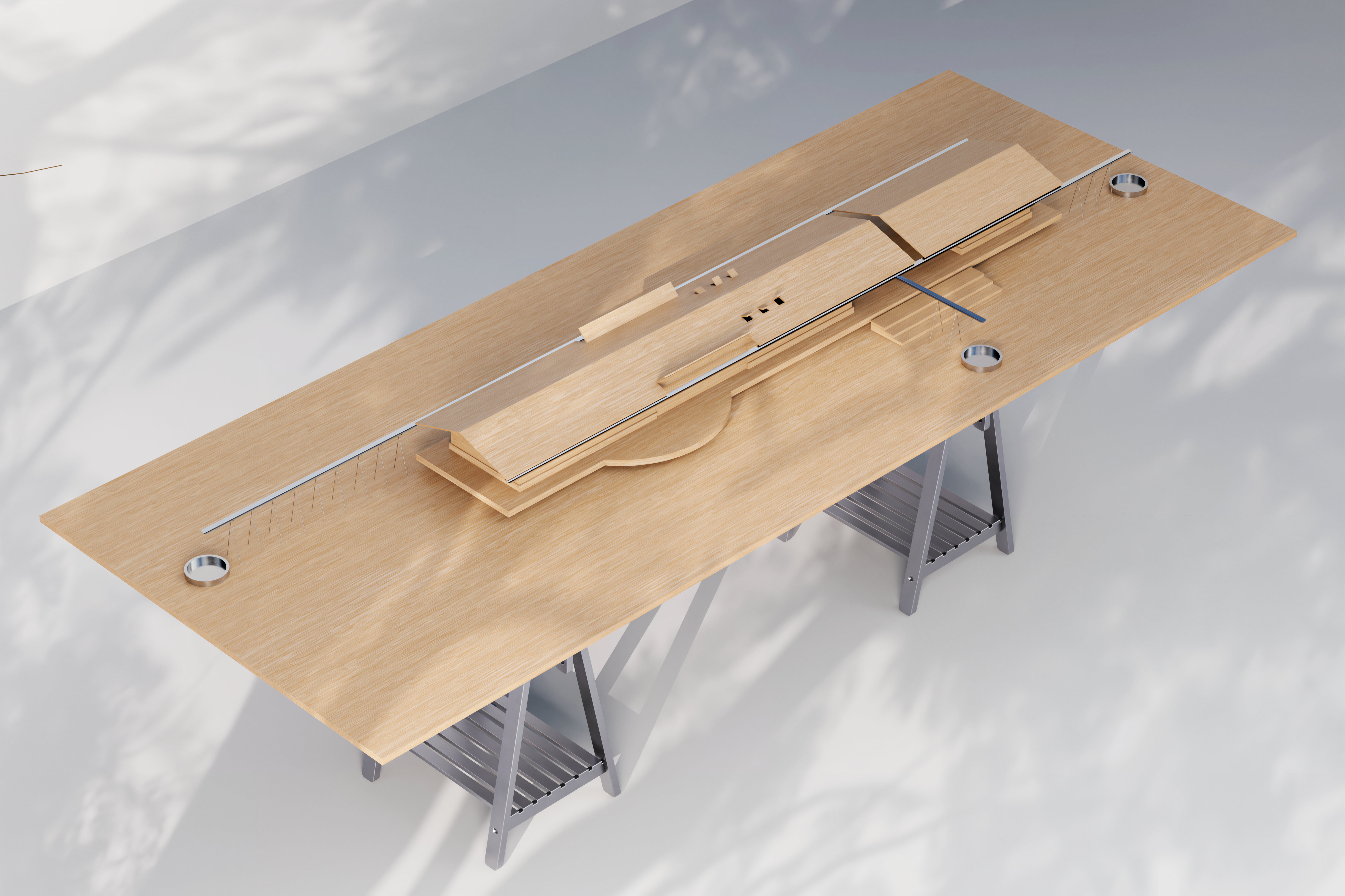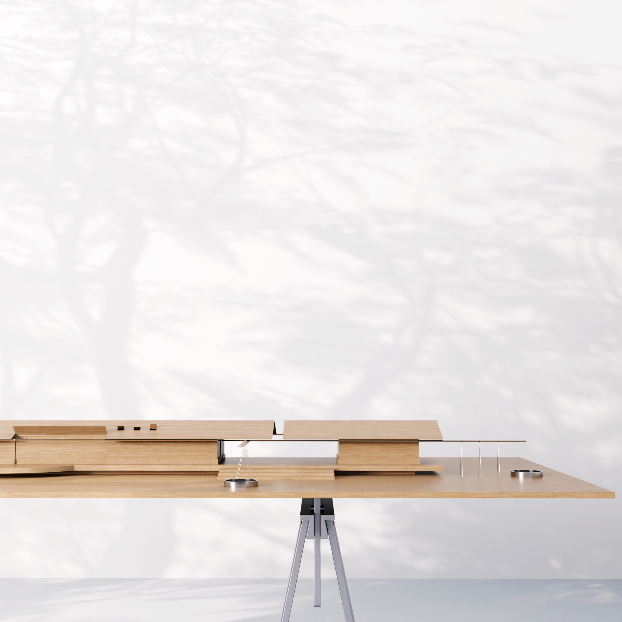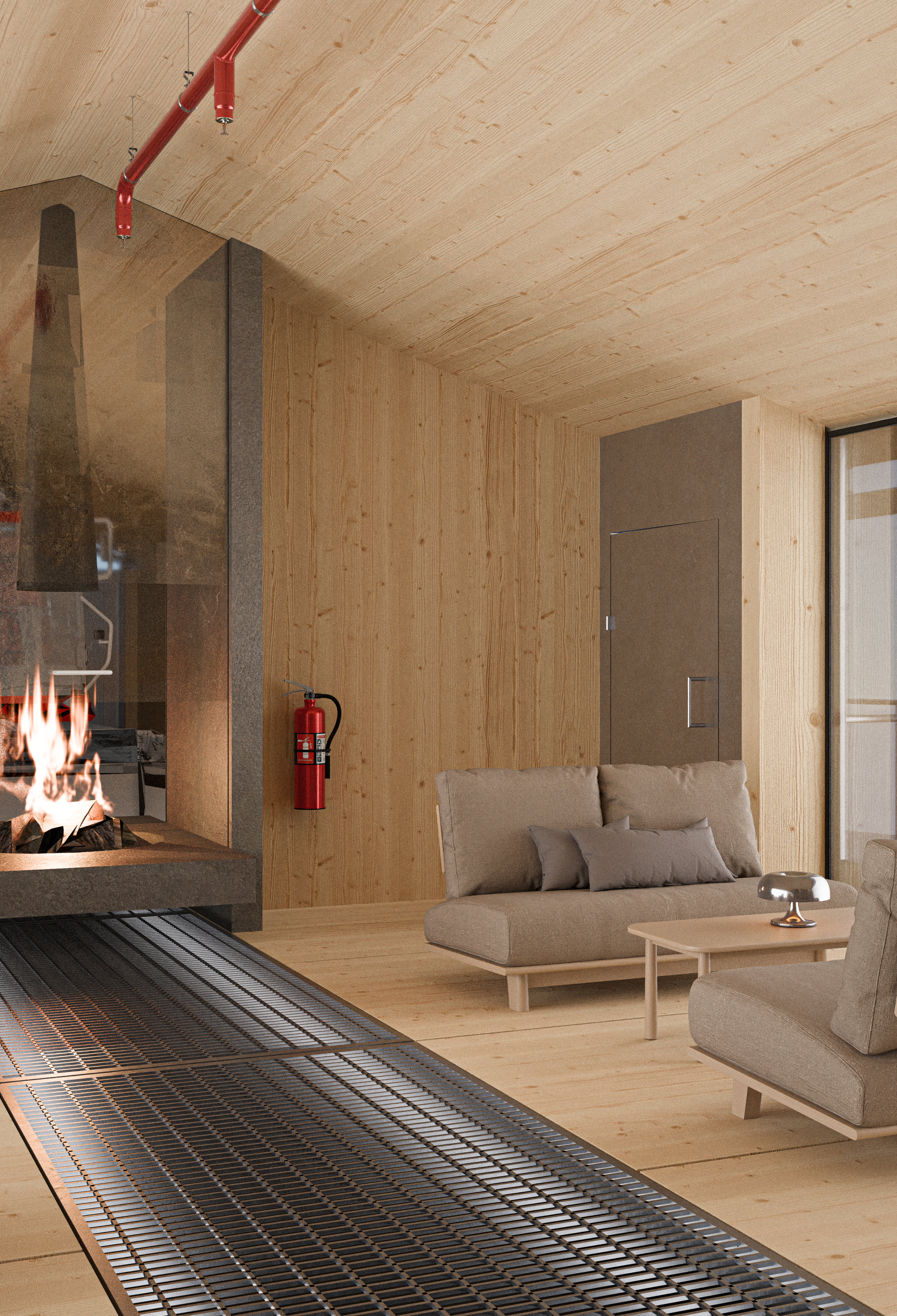A cozy resting space features a central fireplace that visually and functionally connects to the garage area. This fireplace creates a warm, inviting ambiance enjoyed from both spaces. The garage is seamlessly integrated, ensuring easy access while maintaining aesthetic harmony. To maintain tranquility, all technical and utility functions like storage and tuning stations are housed in a detached building, ensuring the main cabin remains a peaceful retreat.