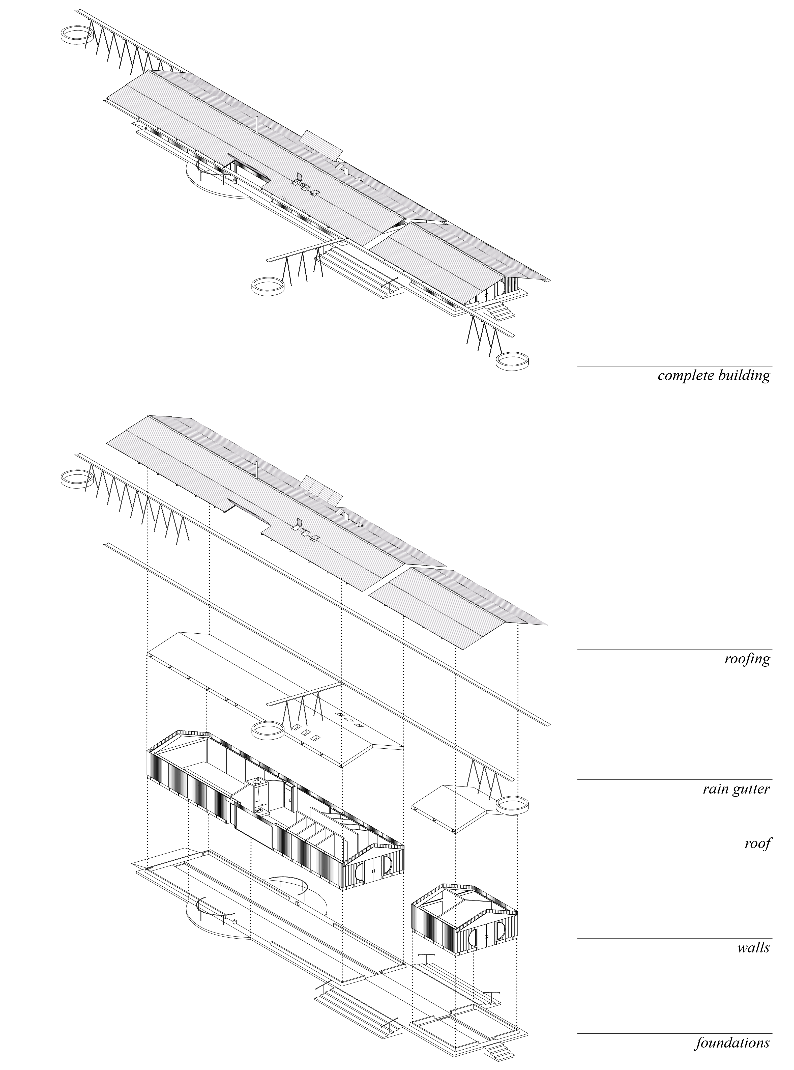 The building’s layout is meticulously designed along an axis, with all rooms aligned in an enfilade arrangement. This design provides a logical flow through the space, enhancing continuity and connection within the cabin.